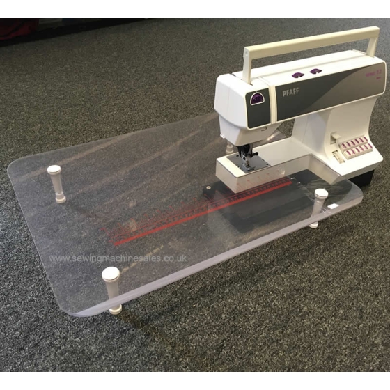 Large Quilters Table for Pfaff sewing machines its size is 23.5 x 17.5 inch and made of sturdy, smooth Plexiglas with handy measurement marking. This terrific table substantially increases your work area to accommodate the extra space quilters need.