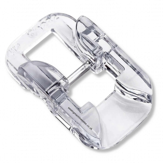 1. Snap on the Beading foot. 2. Thread your machine with invisible thread in the needle and regular sewing thread matching the fabric in the bobbin 3. Select a zigzag stitch or a blind hem stitch. Adjust the settings of the stitch according to the size of the beads. For 4 mm beads Zigzag stitch length 3,5 width 4,0 Blind hem stitch length 1,0 width 4,5 For 6mm beads Zigzag stitch length 6,0 width 6,0 Blind hem stitch length 1,5 width 6,0 4. Place the bead string under the foot in the groove on the underside of the beading foot. 5. Place stabilizer under the fabric. 6. Lower the needle thread tension to achieve a beautiful stitch. 7. Lower the presser foot. Turn the hand wheel to take enough manual stitches to set the beads in place. Stitch the bead string to a scrap piece of fabric fi rst to test thread tension, stitch length and stitch width according to the beads and the fabric. Make adjustments if needed. 8. Stitch slowly. Pfaff Beading Foot 6mm Beads.
