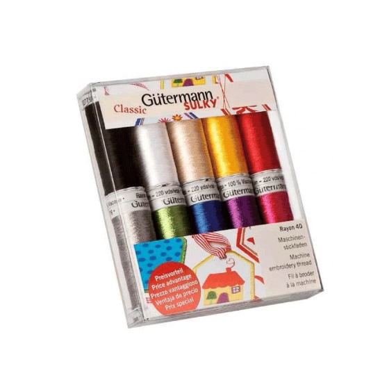 This set of Gutermann Sulky Rayon 40 machine embroidery thread contains 10 classic colour reels