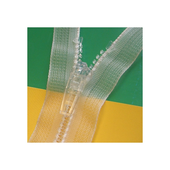 This zipper in made from clear plastic which will when fitted into clothing will blend into the fabric colour and help make the zip transparent.